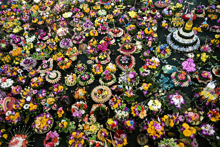 5日、タイの首都バンコクの公園で、池の水面を埋め尽くす色とりどりの灯籠。毎年この時期の満月の夜に行われる「ロイクラトン祭り」では、花で飾り付けた「クラトン(灯籠)」を月が映る水面に浮かべるという。 【AFP時事】