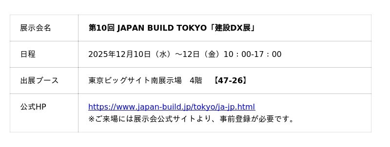 誰とでもつながれる。圧倒的に伝えられる。現場が求めたコミュニケーションツール「SynQ Remote(シンクリモート)」を開発提供する株式会社クアンド(本社:福岡県北九州市、代表取締役CEO:下岡 純一郎)は、2025年12月10日(水)~12日(金)に東京ビッグサイトで開催される「ジャパンビルド-建設DX展」に出展します。会場では、遠隔巡視の法整備から1年で進んだ建設現場の遠隔化事例や、「人手不足」「技術継承」など現場が直面する課題への解決アプローチを紹介。“若手とベテランをつなぐ共創プラットフォーム”としての活用方法をご提案します。