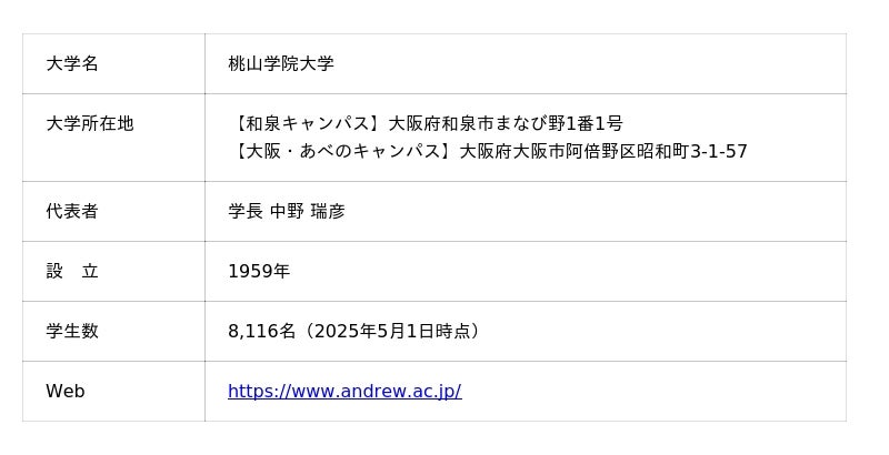 桃山学院大学は、1884年に英国国教会の流れを汲む英学校をルーツとして、1959年に開学し、2024年には学院創立140周年、大学開学65周年を迎えました。課題解決型授業の先駆者的学びのあるビジネスデザイン学部(大阪府大阪市)に代表される実践的な学びに加えて、国際体験プログラムや地域連携、ボランティア等課外活動プログラムも充実しています。