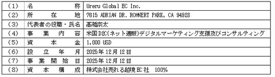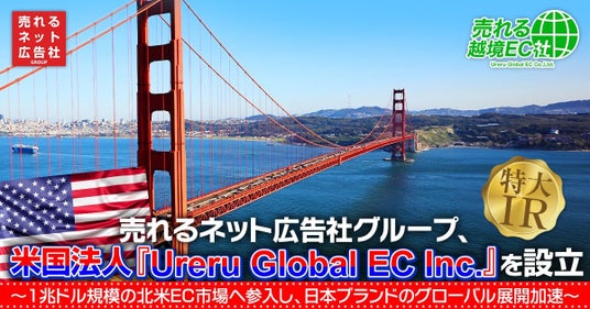 売れるネット広告社グループ株式会社(本社:福岡県福岡市、代表取締役社長 CEO:加藤公一レオ、東証グロース市場:証券コード9235、以下 売れるネット広告社グループ)の連結子会社である株式会社売れる越境EC社は、世界最大のEC超大国・アメリカ市場への参入に向け、新たに米国法人「Ureru Global EC Inc.」をカリフォルニア州・サンフランシスコ近郊のロナートパークに設立いたしました。