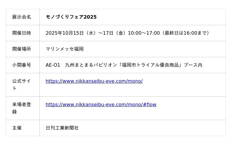 株式会社Braveridge(ブレイブリッジ、本社:福岡県福岡市西区、代表取締役社長 小橋泰成、以下Braveridge)は、2025年10月15日(水)~17日(金)にマリンメッセ福岡で開催される「モノづくりフェア2025」(主催:日刊工業新聞社 西部支社)に出展いたします。