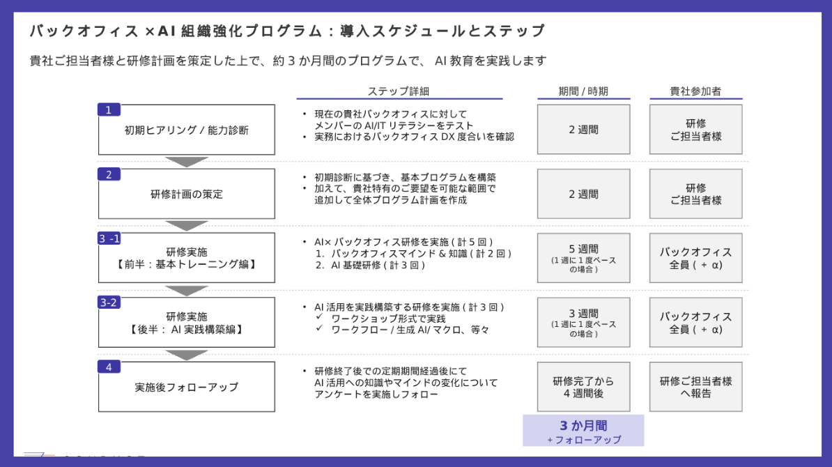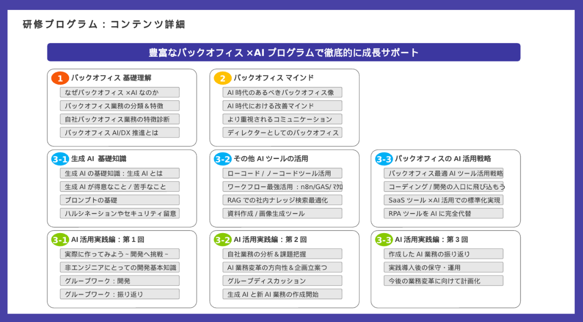 実践に即した研修にすべく、バックオフィスの基本理解やマインドチェンジから段階的にAI実装へ伴走支援を行います。