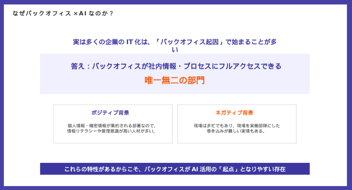 AIをただ使うだけではなく、自社戦略や業務フローを見据えた"マインドセット"と“運用定着”で成果を求める組織である」と、バックオフィス現場で痛感してきました。