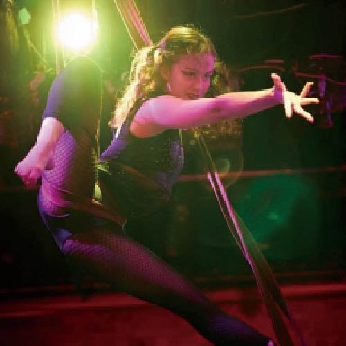 長いストラップを使い、空中で繰り広げられるダイナミックなアクロバット。 スピード感あふれる動きと、静止の中に宿る美しいポーズが魅力のアクト。