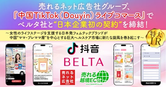 売れるネット広告社グループ株式会社(本社:福岡県福岡市、代表取締役社長 CEO:加藤公一レオ、東証グロース市場:証券コード 9235、以下 売れるネット広告社グループ)は、連結子会社である株式会社売れる越境EC社(本社:東京都港区、代表取締役社長CEO:高橋宗太 以下 売れる越境EC社)が、株式会社ベルタ(本社:東京都港区、代表取締役社長:武川 克己、以下 ベルタ社)より、『中国TikTok(Douyin)ライブコマース』運営代行業務を正式に受注したことをお知らせいたします。