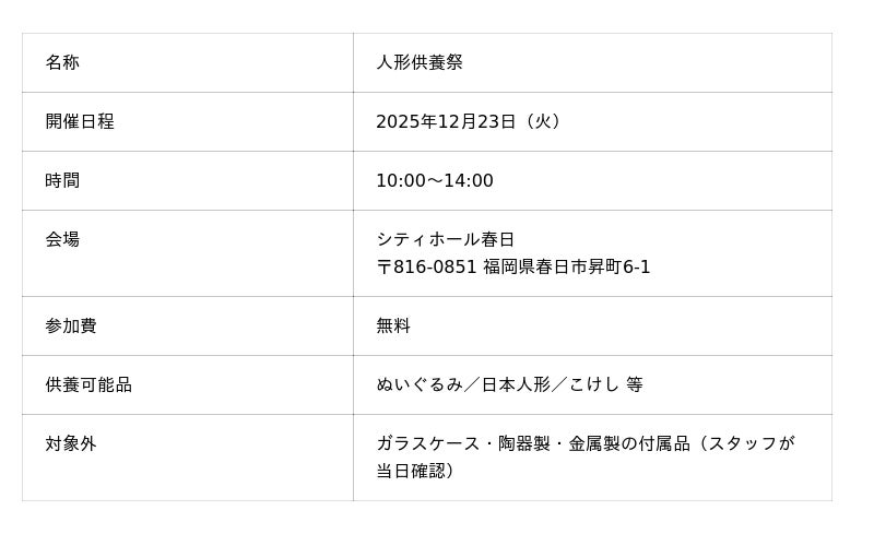 「人形供養祭」 を シティホール春日(福岡県春日市昇町6-1) にて開催いたします。