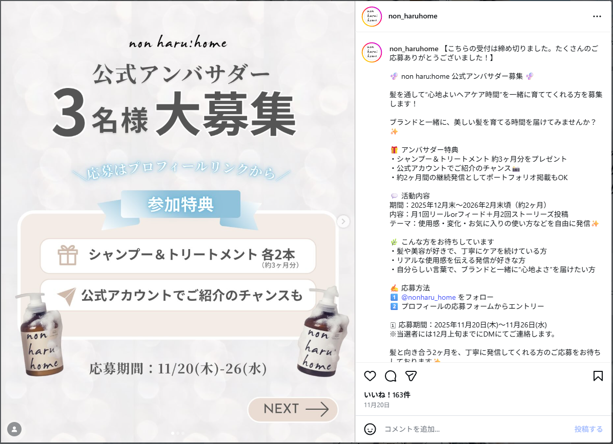 non haru:homeアンバサダーは、Instagramでnon haru:homeと暮らす生活を発信いただく取り組みです。今回の取り組みに続き、2026年には第二期アンバサダーの募集も予定しております。ご興味をお持ちいただける方は、【non haru:home公式Instagram】をフォローのうえ、募集開始をお待ちください。なお、アンバサダーに就任された方には、non haru:homeの対象商品をプレゼントとしてお届けいたします。