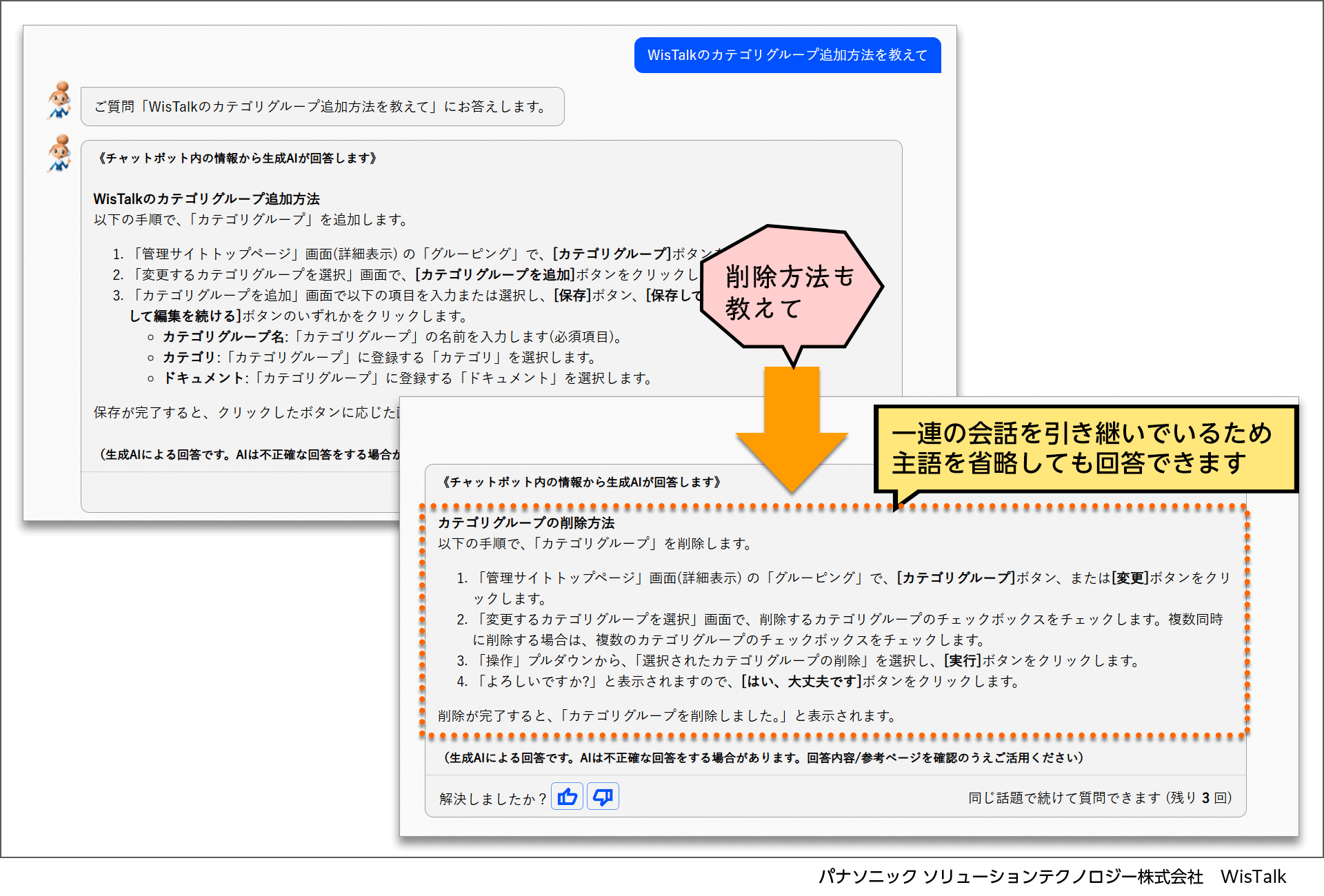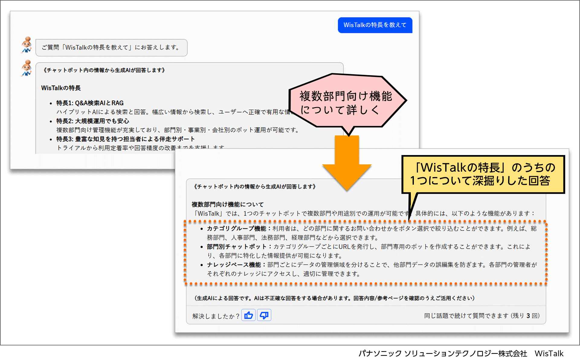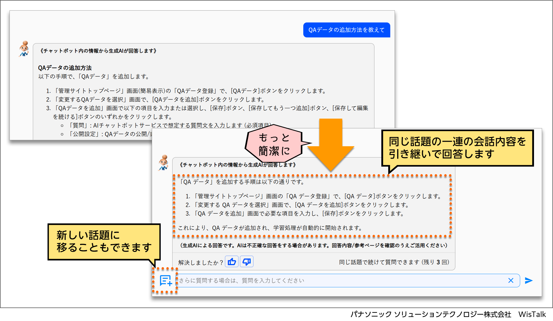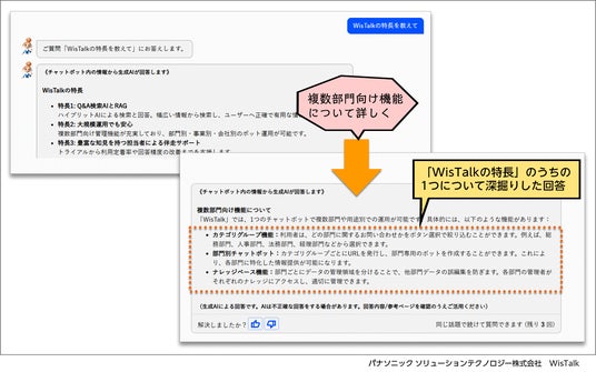 今回のバージョンアップでは、生成AI自動回答の際、一つの質問を基に会話形式で質問や要望を重ねて答えを導きだすことが可能なマルチターン機能を追加。本機能により、WisTalkとより自然な会話を通じてスムーズに回答を得ることができます。