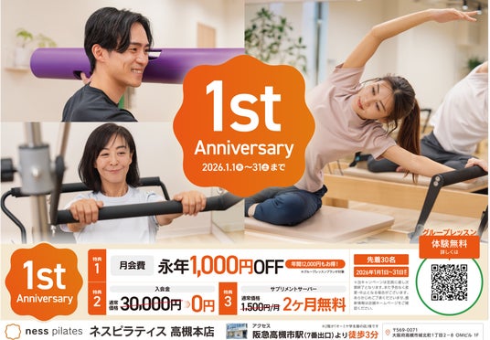 この1年で、高槻本店を皮切りに札幌、福岡と計3店舗を展開。激戦区のピラティス市場において、会員数300名突破という実績と、継続率96%という高い顧客満足度を記録しております。日頃の感謝を込め、2026年1月31日(土)まで「1周年記念キャンペーン」を高槻本店にて開催いたします。