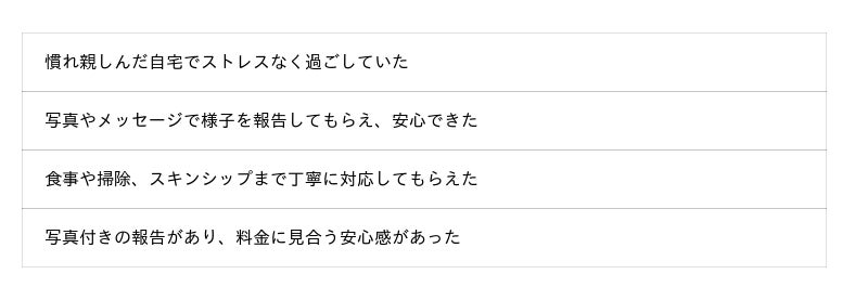 これらの回答から、自宅で過ごせることによるペットのストレス軽減や、写真・レポートによる報告体制が、再利用意向につながっていることがうかがえます。