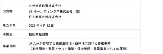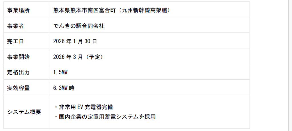 九州旅客鉄道株式会社(本社:福岡県福岡市、代表取締役 社長執行役員:古宮 洋二、以下、「JR九州」)、住友商事株式会社(本社:東京都千代田区、代表取締役 社長執行役員 CEO:上野 真吾、以下、「住友商事」)、住友商事九州株式会社(本社:福岡県福岡市、取締役 社長執行役員:齊田 忠勇、以下、「住友商事九州」)により出資・設立された、でんきの駅合同会社(職務執行者:浅岡 裕・小島 慶太、以下「でんきの駅」)は、2026年1月30日、熊本県熊本市において、第2号案件となる系統用蓄電事業「でんきの駅富合」を完工しました。今後、設備の本格稼働に向けた調整を行った後、系統用蓄電池として需給調整市場(※1)および容量市場(※2)に参入します。